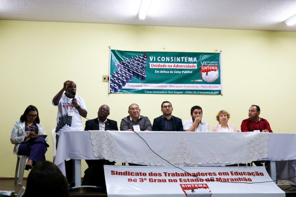 Participaram da mesa de abertura, o professor João de Deus, pró-reitor de Planejamento da Universidade Federal do Maranhão – UFMA, representando a reitora, professora Nair Portela; João Paulo Ribeiro, o ‘JP’, diretor da Central dos Trabalhadores e Trabalhadoras do Brasil – CTB, e da Federação de Sindicatos de Trabalhadores Técnico-administrativos em Instituições de Ensino Superior Públicas do Brasil – FASUBRA; Joel Nascimento, presidente estadual da CTB Maranhão; Sirliane Paiva, presidente da Apruma – Seção Sindical do Andes na UFMA; Arkley Bandeira, presidente do Sindicato dos Professores da UFMA – SINDUFMA; Graça Ferro, vice-presidente da Associação dos Amigos da UFMA – AAUFMA; Raimundo Oliveira, presidente do Sindicato dos Trabalhadores em Educação Básica das Redes Públicas Estadual e Municipais do Estado do Maranhão – SINPROESEMMA; e Ademar Sena de Carvalho, presidente do SINTEMA.