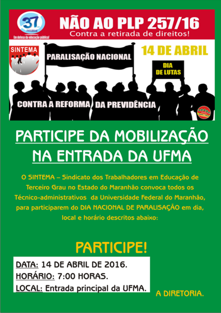 ← Aprimoramento da carreira para os aposentados Sintema elege membros da comissão eleitoral para eleições sindicais – 2016/2020 → DIA 14 DE ABRIL: SERVIDORES DA UFMA VÃO DIZER NÃO AO PLP 257/2016. PARTICIPE! Por Imprensa Sintema | Publicado abril 12, 2016 Post a Comment Cancelar respostaYour email is kept private. Required fields are marked *Comentário Nome * E-mail * Site Salvar meus dados neste navegador para a próxima vez que eu comentar. ← Aprimoramento da carreira para os aposentados Sintema elege membros da comissão eleitoral para eleições sindicais – 2016/2020 →