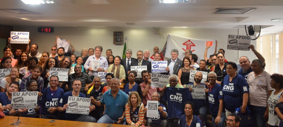 Fruto do trabalho do movimento grevista, visitas à parlamentares e reuniões com a Frente Parlamentar Mista, o Comando Nacional de Greve (CNG) da FASUBRA Sindical participou na manhã de ontem, 15, da Audiência Pública “Valorização da educação e dos trabalhadores da educação”. O evento promovido pela Comissão Permanente de Direitos Humanos e Legislação Participativa (CDH), foi realizado no Anexo II, Ala Nilo Coelho do Senado Federal, Brasília-DF. Também participaram as entidades: Sindicato Nacional dos Docentes das Instituições de Ensino Superior (ANDES-SN) e Sindicato Nacional dos Servidores Federais da Educação Básica, Profissional e Tecnológica (SINASEFE).