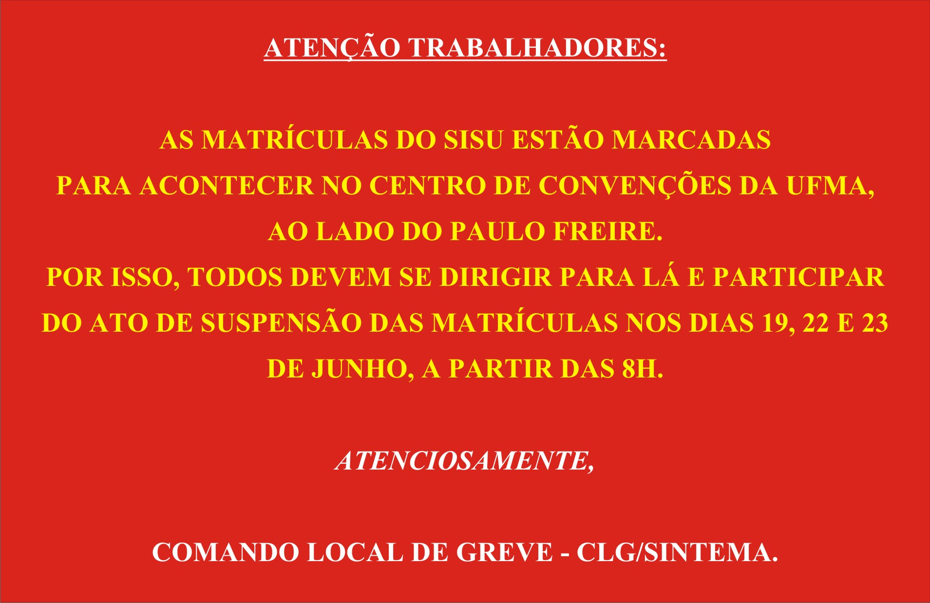 ← Comando Local de Greve – CLG/SINTEMA realizou fechamento da Biblioteca da UFMA na tarde de hoje (18) Obituário: João da Mata Magalhães → Mobilização de suspensão das matrículas do SISU ocorrerá no Centro de Convenções da UFMA Por Imprensa Sintema | Publicado junho 18, 2015 Post a Comment Cancelar respostaYour email is kept private. Required fields are marked *Comentário Nome * E-mail * Site Salvar meus dados neste navegador para a próxima vez que eu comentar. ← Comando Local de Greve – CLG/SINTEMA realizou fechamento da Biblioteca da UFMA na tarde de hoje (18) Obituário: João da Mata Magalhães →