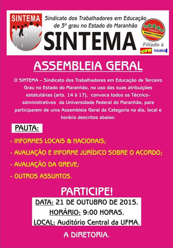 ← AAUFMA realiza jantar dançante dia 30 de outubro. Participe! Trabalhadores avaliam Acordo e Greve em Assembleia Geral → Sintema convoca categoria para Assembleia Geral nesta quarta-feira (21). Participe! Por Imprensa Sintema | Publicado outubro 20, 2015 Post a Comment Cancelar respostaYour email is kept private. Required fields are marked *Comentário Nome * E-mail * Site Salvar meus dados neste navegador para a próxima vez que eu comentar. ← AAUFMA realiza jantar dançante dia 30 de outubro. Participe! Trabalhadores avaliam Acordo e Greve em Assembleia Geral →