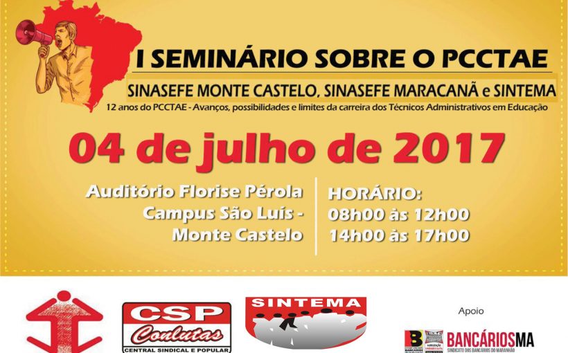 O Sintema e Sinasefe realizam no dia 4 de julho, no Auditório Florise Pérola, no IFMA Campus Monte Castelo, o I Seminário voltado para os técnico-administrativos: é o seminário dos doze anos do Plano de Carreira dos Cargos Técnico-Administrativos em Educação (PCCTAE), conquista da categoria que a cada dia sofre ameaças por parte de um governo ilegítimo marcado pelo ataque aos direitos dos trabalhadores. O professor da Universidade Federal de Uberlândia (UFU), Paulo Henrique Rodrigues dos Santos será um dos palestrantes.