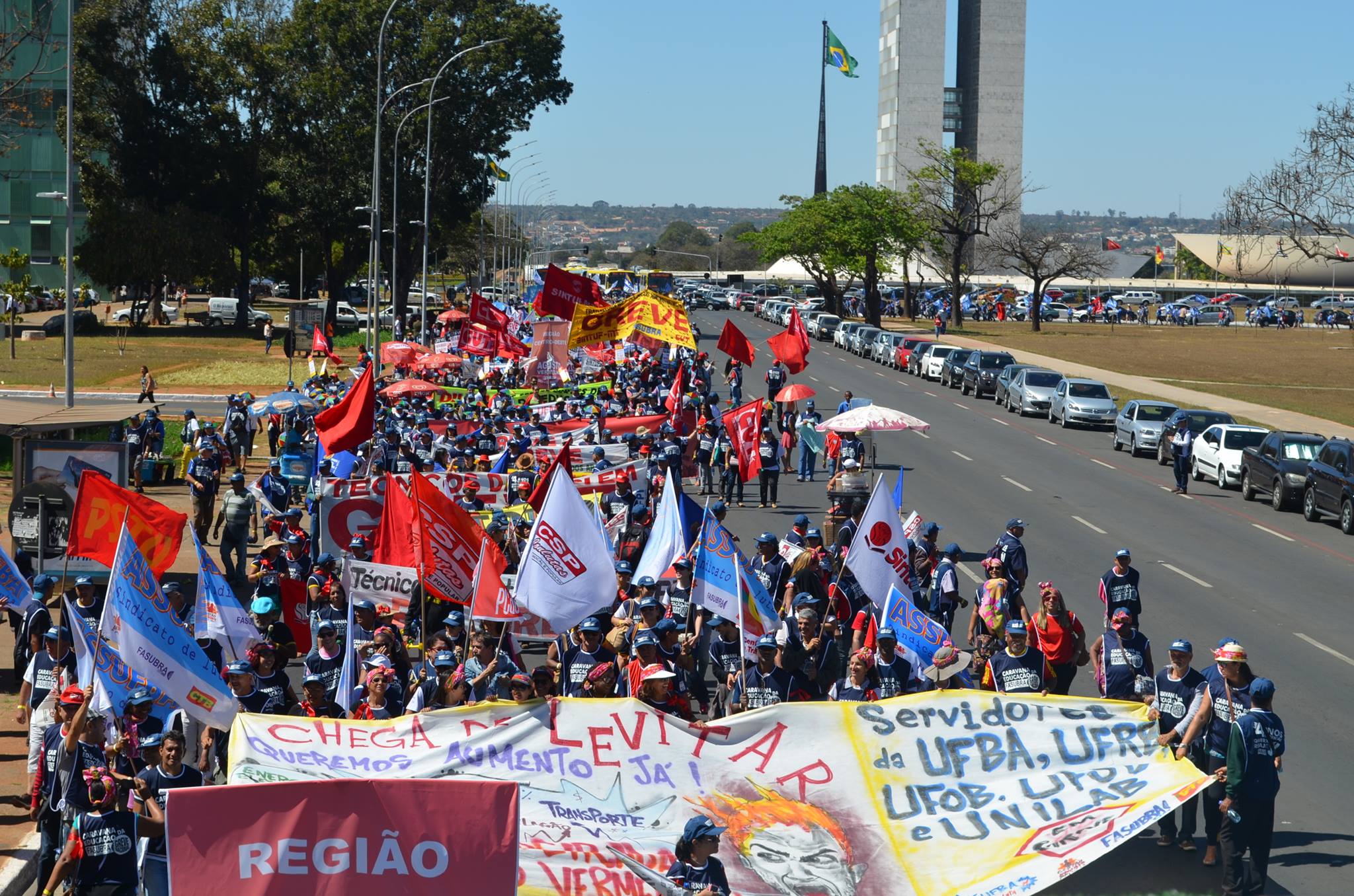 Cerca de três mil trabalhadores em greve de todo o país, chegaram em caravana à Brasília – DF nesta manhã, 5, para reivindicar do governo federal o avanço nas negociações. Por uma educação pública, gratuita e de qualidade, ocuparam as ruas da capital federal. A Caravana da FASUBRA, instalada na Esplanada dos Ministérios, conta com infraestrutura desde higiene pessoal, acomodação na tenda, alimentação e hidratação. Com o objetivo de chamar a atenção da sociedade, os servidores públicos seguiram em marcha organizados com faixas, cartazes, bandeiras e trio elétrico.